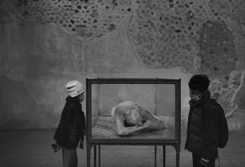 Bir müze çalışanı, taşlaşmış bedenlerin arasında dolaşıyor. Onlara dokunmuyor ama onları yalnız bırakmıyor da. Sanki yaptığı iş korumak değil, refakat etmek. Cam vitrinlerin içindeki figürler birer sergi nesnesi olmaktan çıkıp bekleyen varlıklara dönüşüyor. Kadının sessizliği, bu bekleyişin diline uyum sağlıyor. Burada ölüm, çoktan gerçekleşmiş bir olay değil; hâlâ süren bir durum gibi.